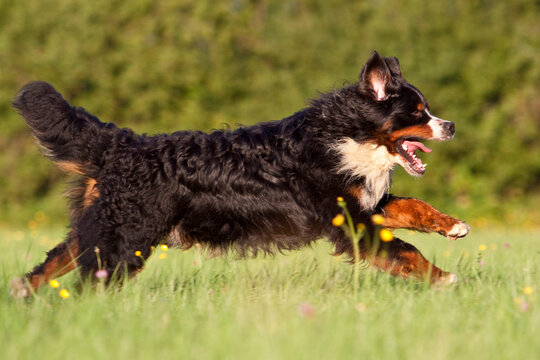 Fluffy poodle joyfully running outdoors in sunlight