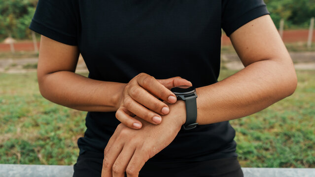 Women finishing running on the road, Completing the running practice goal, Running statistics icon, selective and soft focus.