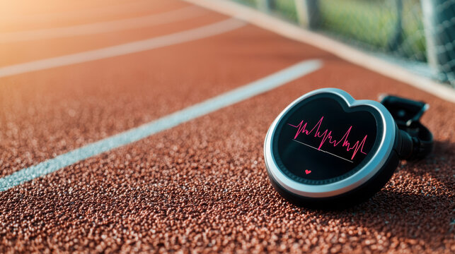 Concept of health and fitness data. A sleek heart rate monitor rests on a running track, reflecting a focus on fitness and health, capturing the essence of athletic performance.