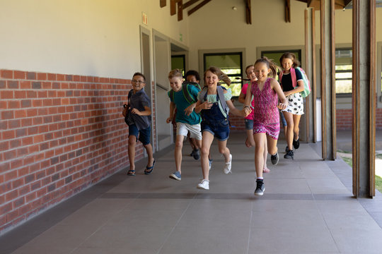 Group of schoolchildren running in an outdoor corridor at elementary school