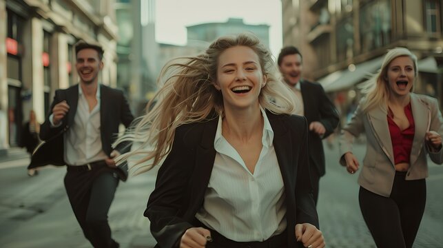 A group of young business people running in the street, laughing and having fun while doing advertising for their brand during an event or party on city streets, all looking at camera. generative AI