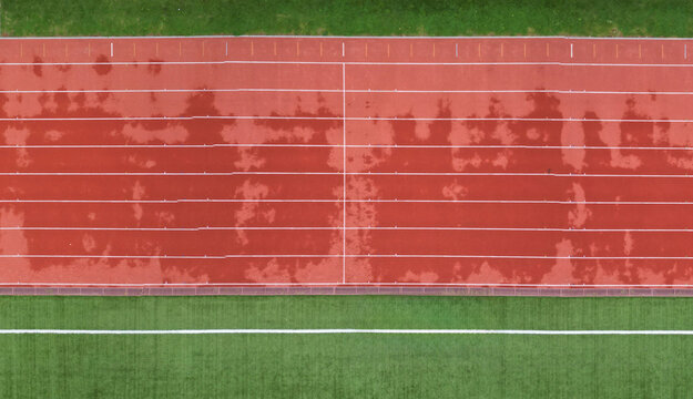 Top view of red running track lanes with white markings bordered by green field surface, suitable for athletics themes, sports design materials, fitness visuals and training-related concepts.