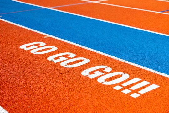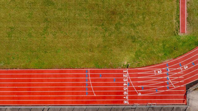 Aerial view of athlete on red track field. A lone athlete runs on a striking red track, captured from above, with white lane markings and colorful indicators.