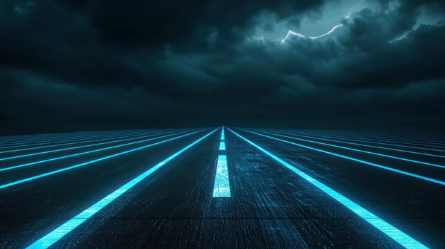 futuristic running track with neon blue lane markings under stormy sky, creating dramatic and intense atmosphere. glowing lines contrast with dark clouds and lightning