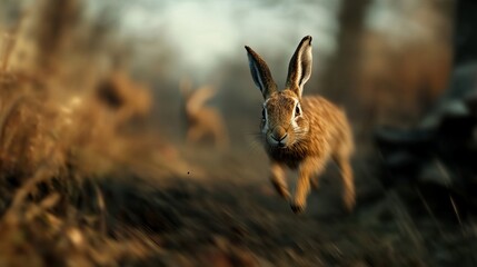 A lively brown rabbit sprinting through a blurred autumn forest setting, showcasing its agility and playful spirit.