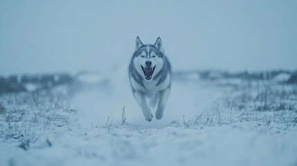 A beautiful Siberian Husky running joyfully through a snowy landscape, with a playful expression and a vibrant fur coat.