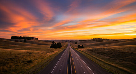 Empty asphalt road cuts through grassy field towards bright sunset horizon. Dramatic orange and teal clouds fill sky above, creating atmospheric journey. Path leads to distant hills under vibrant sun.