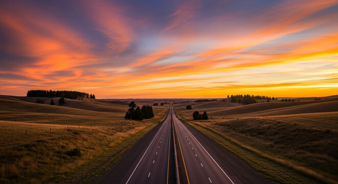 Majestic Sunset Over Highway with a Truck Transporting Goods Through Scenic Landscape of Fields and Trees Under Dramatic Cloudy Sky