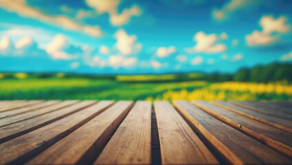 A wooden deck with the sky and clouds in the background, and green fields in the distance.