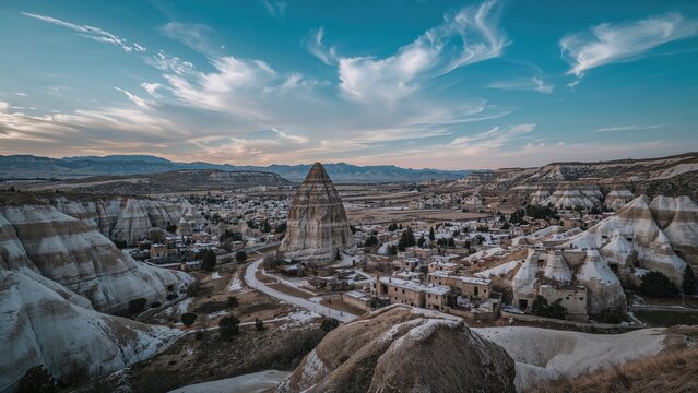 A landscape view of unique rock formations and a small town, with a cloudy sky overhead, in a rugged terrain.