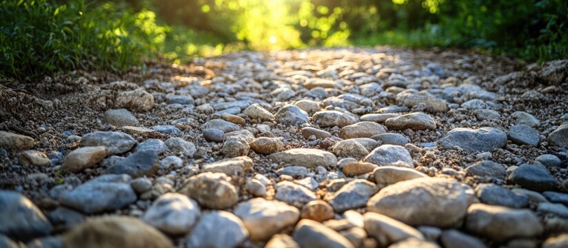 Rural gravel road surface texture with natural stones illuminated by sunlight in a serene outdoor setting