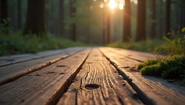 Wooden pathway through forest at sunset with sunlight filtering
