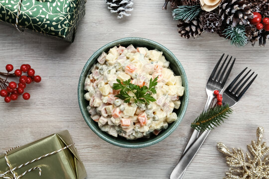 Flat lay composition with traditional russian salad Olivier on white wooden table