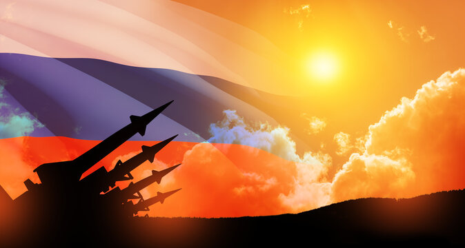 The missiles are aimed at the sky at sunset with Russian flag. Nuclear bomb, chemical weapons, missile defense, a system of salvo fire. 3d-rendering.