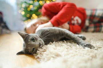 Cute Russian Blue purebred cat relaxing in living room on Christmas day. Spending time with family and pets on Christmas.