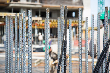 close up of a steel rebar mesh being set into a freshly poured concrete wall, the reinforcement bars visible through the semi-transparent concrete, with some excess concrete oozing from the gaps