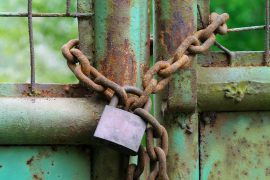 A rusted chain links together in a chain link fence, with a blurred green background.