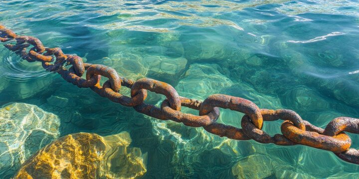 Rusty metal chain submerged in clear sea water, with the chain s texture and color contrasting beautifully against the vibrant water, creating a striking visual in the harbor environment.