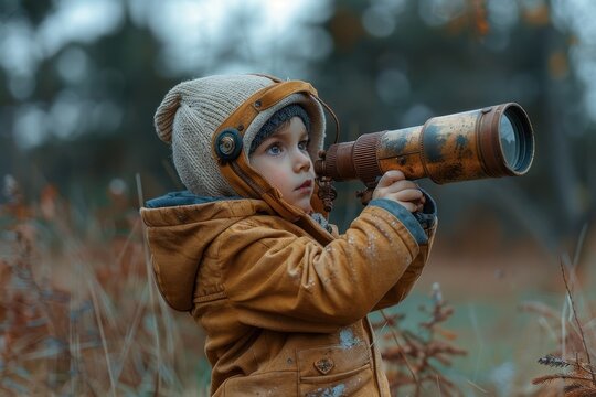 A young child dressed in a vintage pilot outfit holds a rusty telescope in an autumn setting