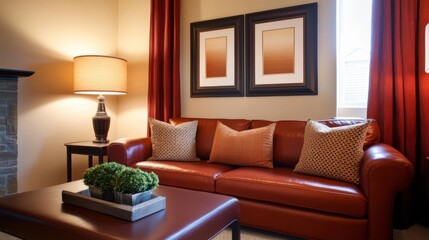 Cozy Bedroom with Soft Beige and Rust Decor Featuring Elegant Framed Artwork and Plush Cushions