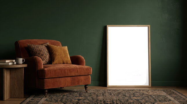 An attractive rust-colored armchair with decorative cushions and a side table displaying books and cups beside a transparent frame.