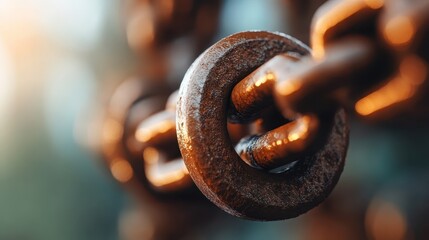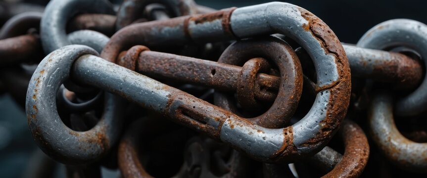 A closeup of heavy rusted metal chains with a weathered patina reflecting soft light on a dark industrial background