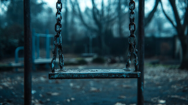 An empty swing in an abandoned playground.
