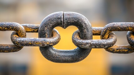 A close-up of a rusted chain link with a yellow background.
