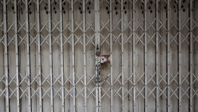 Old metal folding gate with weathered texture and rust details, representing urban background, security concept, and industrial surface.
