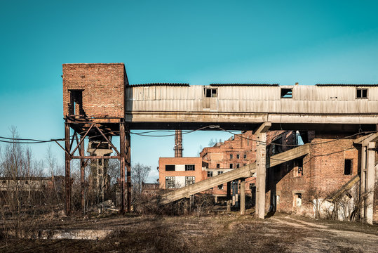 Corroded x-shaped pipelines sparking blue arcs over overgrown abandoned factory courtyard