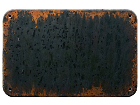 Blank rusted metal plate on a transparent background. PNG image of a blank metal signboard covered in rust.