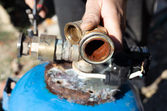 The rusted water distribution unit of the hydraulic tank of the water station was disassembled for repair