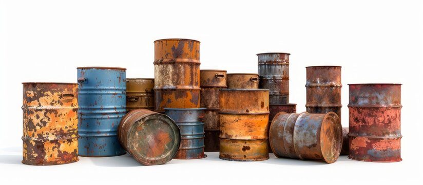 Rusty barrels of hazardous waste on a white backdrop.