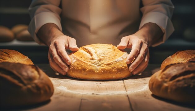 Baker's hands carefully holding a golden-crusted, freshly baked artisan bread loaf on a rustic wooden table in a warm bakery setting.