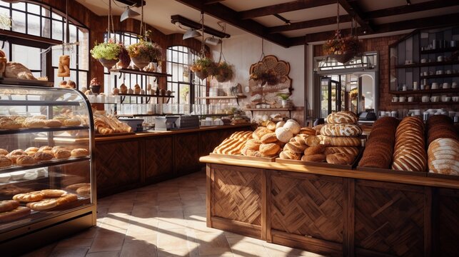 Cozy bakery interior showcasing fresh bread and pastries with rustic wooden decor
