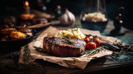 Gourmet steak dinner on a rustic wooden table, captured with dramatic lighting and moody tones in high-contrast, professional studio food photography