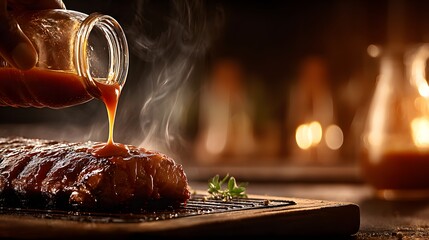 Man holding barbecue ribs with sauce dripping, rustic wooden background and room for text