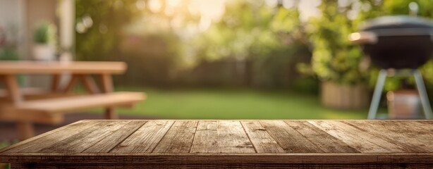 The wooden table in a sunlit backyard with picnic bench and barbecue grill
