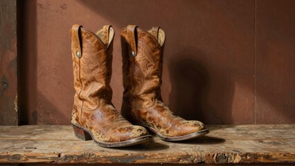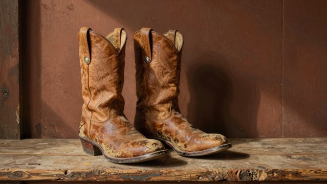 Cowboy boots with laces, hat, and rope worn by a cowboy in a rustic setting, cowboy, western, boots, laces, hat, rope, ranch