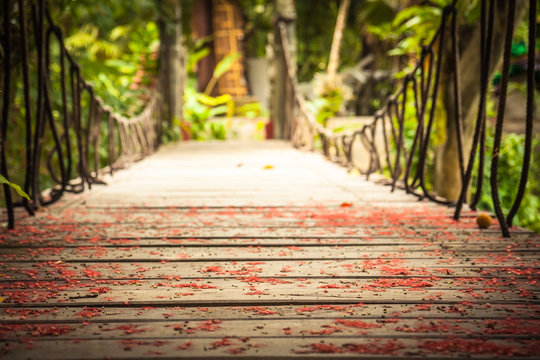 Wooden bridge leading into tropical forest with light at the end of way and blurred background