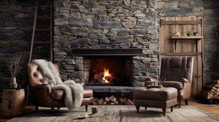 Vintage wooden furniture in rustic log cabin interior