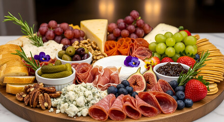 Gourmet cheese platter with cured meat and fresh fruit