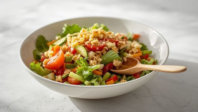 Delicious healthy salad with fresh ingredients and wooden spoon