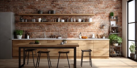 Interior design kitchen with copper colored faucet and sink, wooden countertop and tiled backsplash
