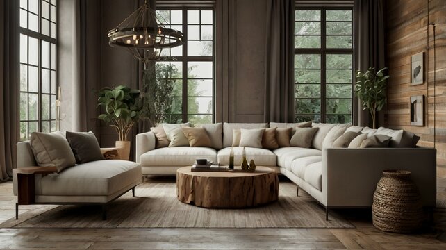 Rustic coffee table near sofa with navy blue pillows in room with brick wall and big black grid windows. Loft home interior design of modern living room.
