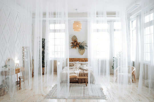 Cozy rustic bedroom with boho ethnic decor. Bright spacious apartment with large windows. Light white curtains in the interior Wooden furniture. Handmade textile. Plants in the interior. Nobody.