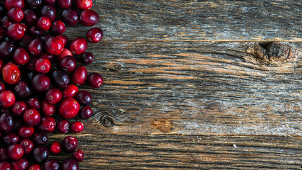 Rustic christmas wood plank backdrop with evergreen garland, red berries and twine