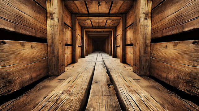 Endless wooden hallway with rich textures and a rustic appearance, creating a sense of depth and infinity.