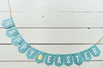 Close up of gold and white easter eggs on painted wooden blue background. Rustic grunge background. Easter eggs with golden serpentine and confetti. Invitation template design, greeting card