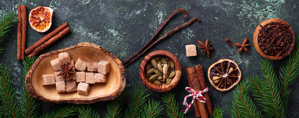 Traditional Christmas spices on green background.